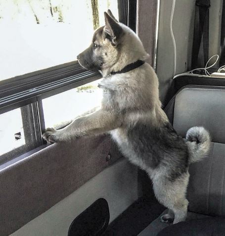 The Wendlands have been gradually introducing their new Norwegian elkhound puppy, Bo, to their motorhome, with plans to hit the road in May.