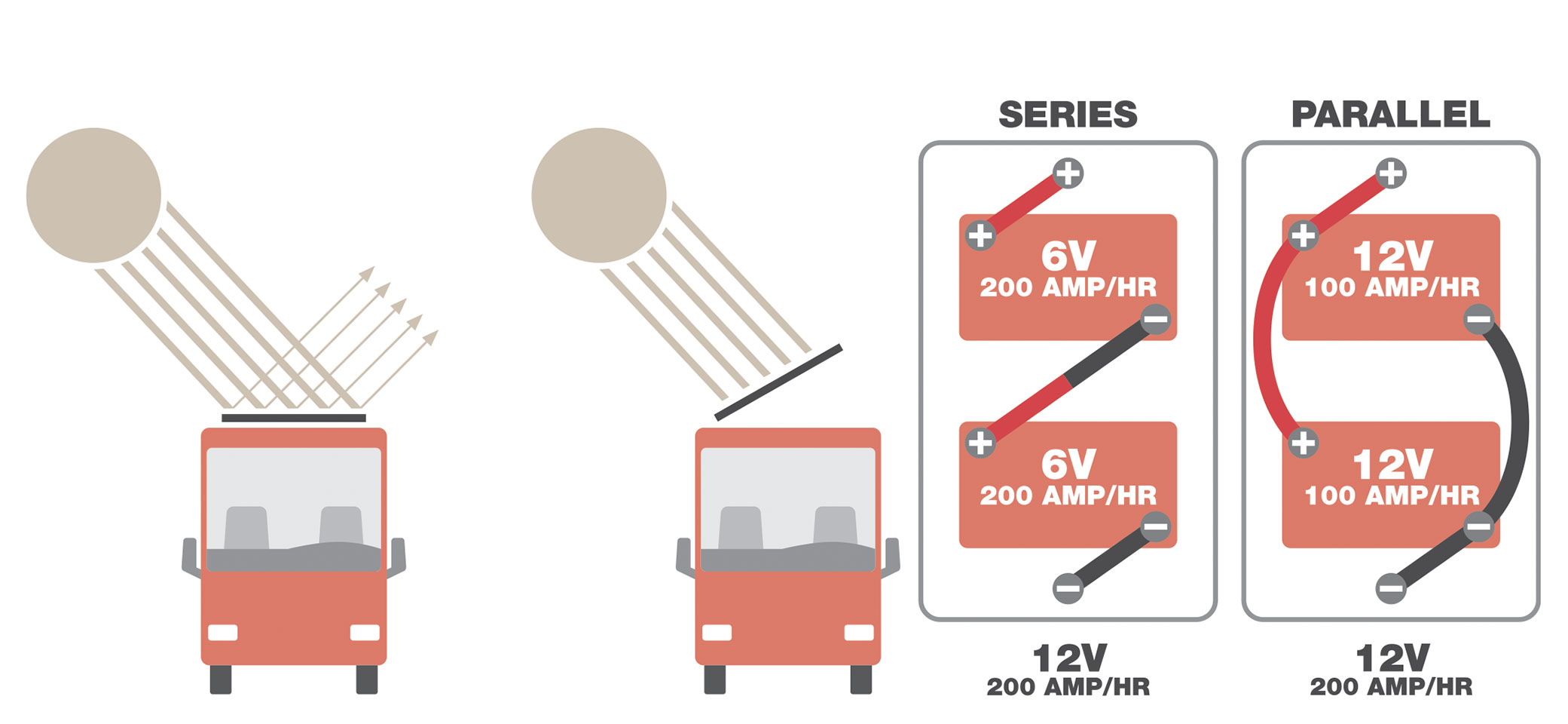 Tilted solar panels collect sunlight more efficiently, because less sunlight reflects off the glass; 6-volt batteries, when used instead of 12-volt batteries, are wired in series to act as one 12-volt battery bank.