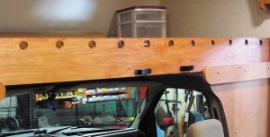 Here is how we ensure that a child does not roll off the sleeping area above the cockpit of a Type C motorhome. We bought a 1-inch-by-8-inch-by-96-inch piece of poplar lumber to serve as a rail. (A 1-inch-by-10-inch piece would be better, and another relatively knot-free wood, such as pine, also could be used.) We sanded, stained, and varnished the wood. We created a pair of cleats, each ½ inch by 1 inch by 6 inches, and secured them on either side of the motorhome walls with screws. The cleats create a groove between the cushions and the back of the cockpit so that the rail can be inserted. We attached ladder brackets to the rail, which can be removed and stored when not in use.