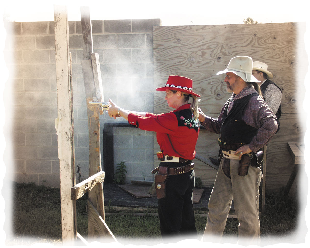 Participants also are required to adopt an alias: one representative of a character or profession from the Old West; a Hollywood Western star; or an appropriate fictional character. The alias is a key part of the cowboy shooting experience, and it influences one’s choice of costume. An alias must be printable for a wide audience (no profanity, please), and it can be used by only one shooter. My paternal grandmother’s maiden name was Henry; she was related to B. Tyler Henry, inventor of the Henry rifle, precursor to the Winchester line of lever-action rifles. So, I adopted B. Tyler Henry as my alias. Deborah goes by La Coquette. To help in the selection process, SASS maintains an online database of aliases along with guidelines for members to follow when creating one.