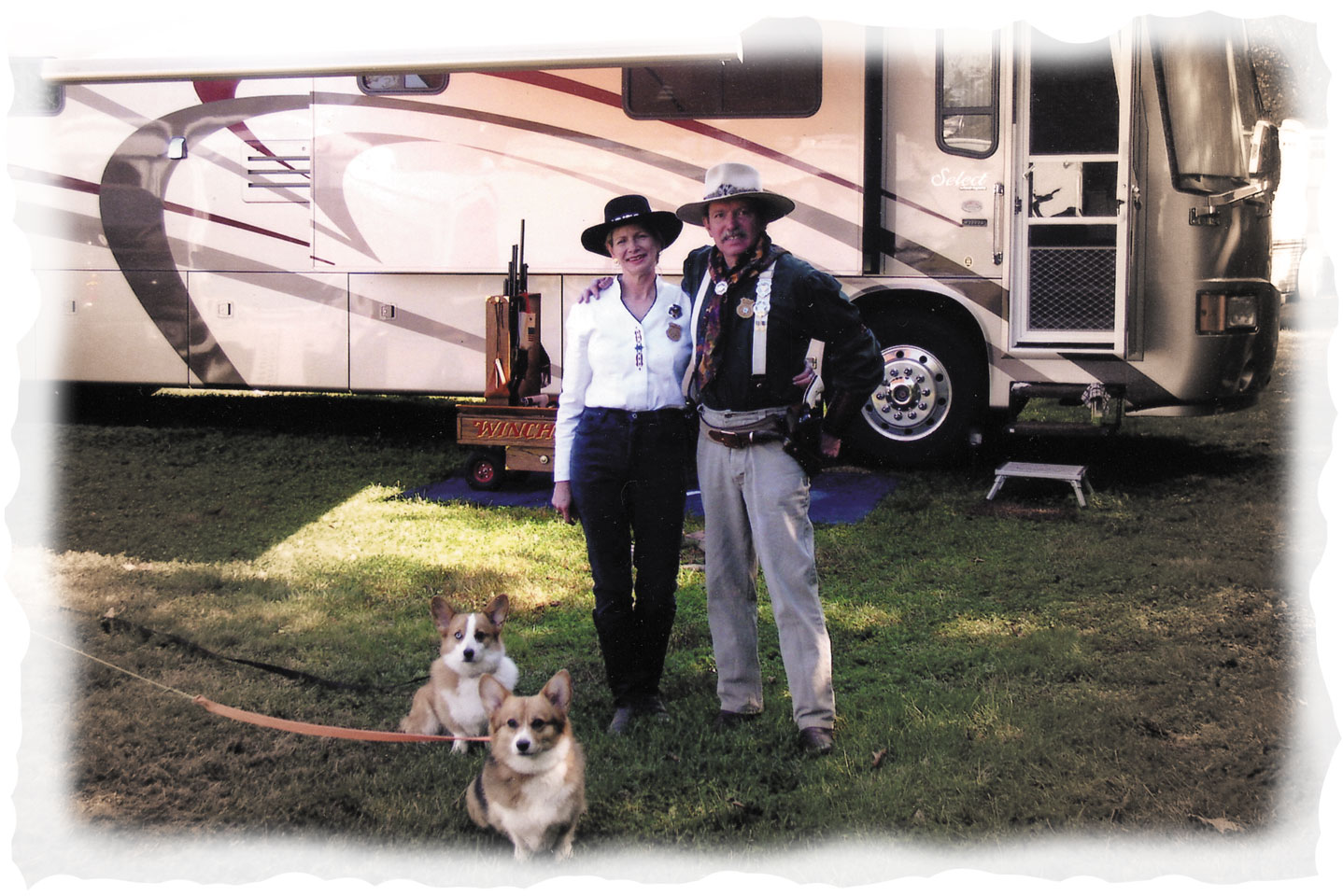 RV parking is available at many Cowboy Action Shooting events, which enables Deborah and Bruce Murphy to bring along their corgis.