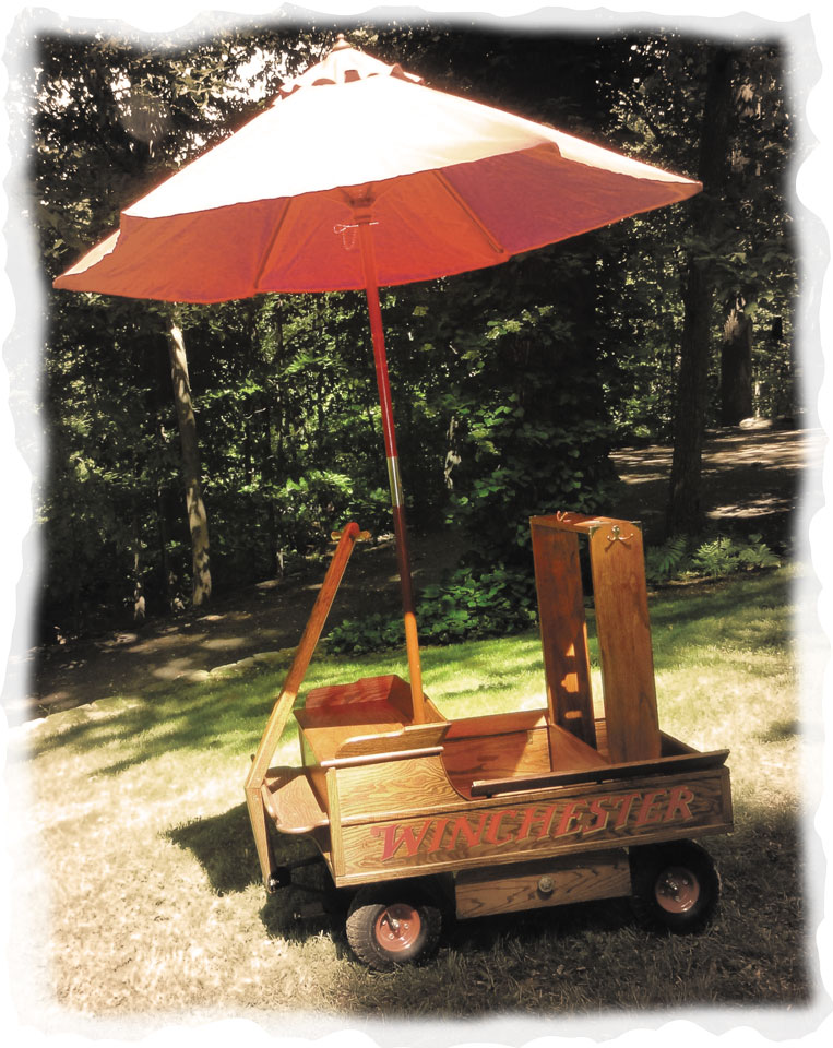 Think of Cowboy Action Shooting as golf with guns. Each shooter has, at a minimum, two pistols, a rifle, and a shotgun, plus more than 100 rounds of ammunition for a typical one-day match. Carrying that load around in a satchel or pack is unwieldly, not to mention exhausting, so shooters resort to using carts equipped with racks for their long guns, as well as places to store ammunition, folding chairs, umbrellas, coolers, etc. At many multiday matches, gun carts are judged for creativity and uniqueness. I built our cart to mimic a miniature Winchester delivery buckboard.