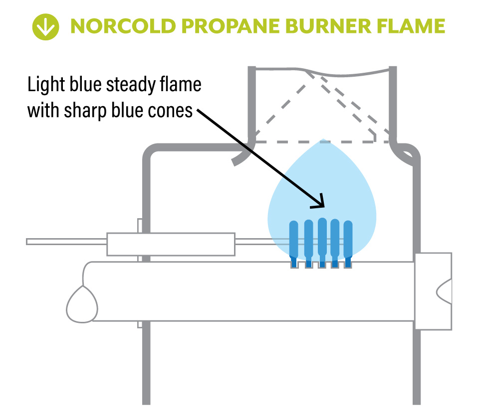 Also, cleanliness of the burner components is crucial. For example, a slight covering of carbon buildup on the flame sensor can cause problems. Such buildup on the electrode probe will insulate and cause erratic operation. Normal maintenance calls for removal of any carbon buildup, so be sure it is inspected during annual preventive maintenance. I recommend using 0000 steel wool to “clean” the electrode periodically. The tip of the sense probe should be positioned over the middle of the slots in the burner and centered on the burner tube. The propane flame should be mostly blue with sharp tips. Make sure the orifice is clean, as well as the primary air intake ports on the housing where the orifice threads into the burner.