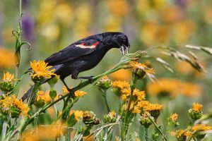 Red-winged blackbirds are commonly seen throughout the year in many parts of the United States and Mexico, including this one spied feasting on seeds along