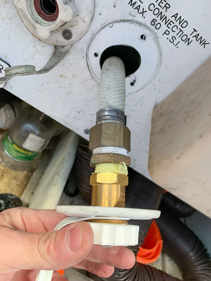 Turn on the water pump (ensure there is water in the fresh tank) prior to reinstalling the fresh-water fitting onto the RV. Carefully inspect the fitting for water leaks, both on the outside as well as around the inside threads where the fitting interfaces with the main water line.
