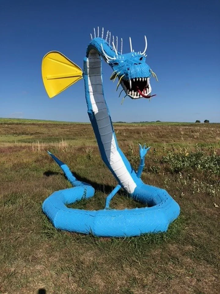 Wayne Porter’s ginormous metal sculptures are crafted from a variety of recycled items, such as scrap metal, old farming equipment, and railroad tie plates.