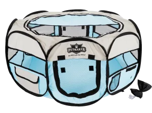 Your dog, cat, or other furry friend can enjoy a safe and cozy spot wherever you roam in a Pop-Up Pet Playpen from PetMaker. The lightweight polyester enclosures set up in seconds for indoor or outdoor use. Mesh windows and a removable roof offer air circulation and sun or shade as needed. Other features include zippered doors, storage pockets, a hole and holder for an external water bottle, a carrying case, and four metal stakes to secure the pen for use outdoors. Various sizes and styles are available. Prices start at $34.99.
