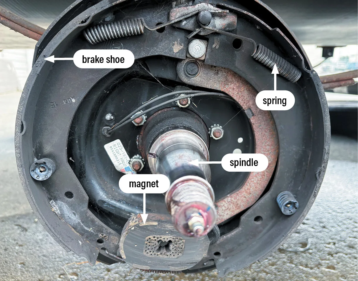 Inspect the backing plate assembly parts for wear or damage. Instead of changing the worn brake shoe above, it may be easier to replace the entire assembly.